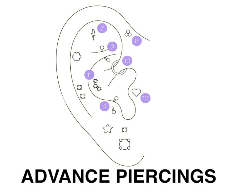 Flat (7), Forward Helix (8), Rook (9), Daith (10), Conch (11) Antitragus (4), Tragus (12), Conch (11) & Industrial Piercings.